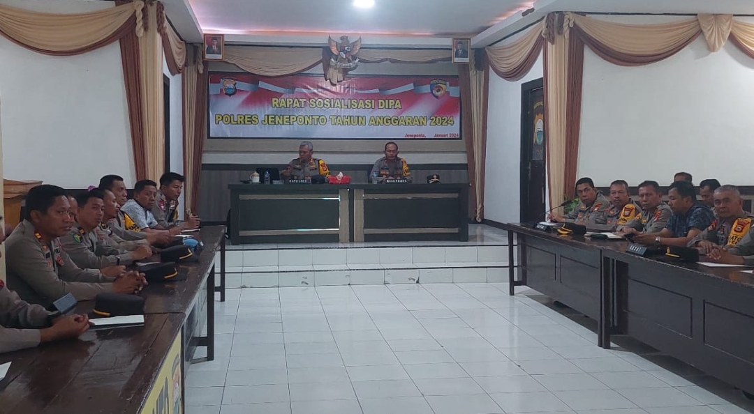 PENJURU. ID | Jeneponto – Kapolres Jeneponto AKBP Budi Hidayat, S.I.K. didampingi oleh Waka Polres Kompol Muh. Idris, S.Sos., MM pimpin sosialisasi Dipa (Daftar Isian Pelaksanaan Anggaran) di Aula Lantai 2 Polres Jeneponto, Jalan Sultan Hasanuddin No.66 Bontosunggu, Selasa (9/1/2024).