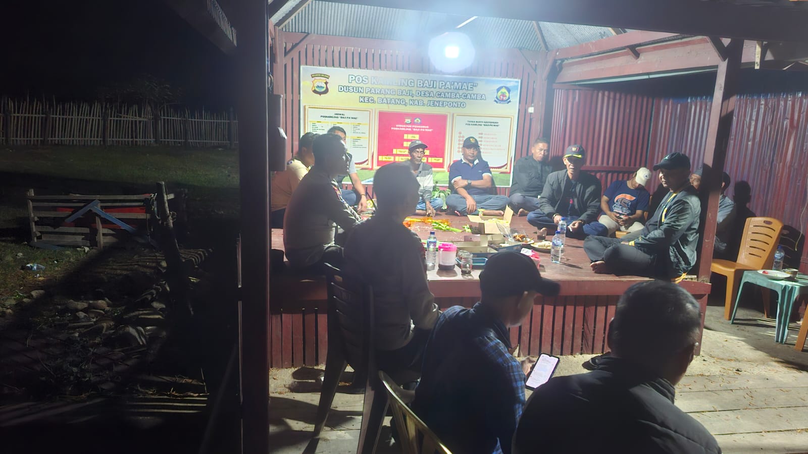 Sekitar pukul 21.30 WITA, Kapolres didampingi Kasat Binmas Polres Jeneponto AKP M. Natsir, S.Sos., dan Kapolsek Batang Iptu Purwanto, S.E., menyambangi Pos Ronda di Dusun Parang Baji, Desa Camba-Camba, Kecamatan Batang.