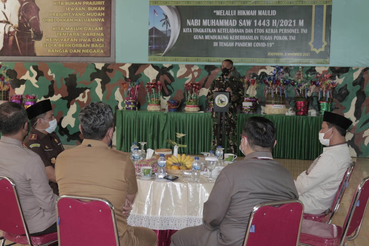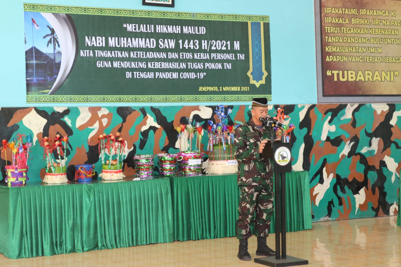Kegiatan tersebut dengan tema “Melalui Hikmah Maulid Nabi Muhammad SAW 1443 M / 2021 H kita tingkatkan ketauladanan dan etos kerja Personil TNI guna mendukung keberhasilan tugas TNI Ditengah Pandemi Covid 19”