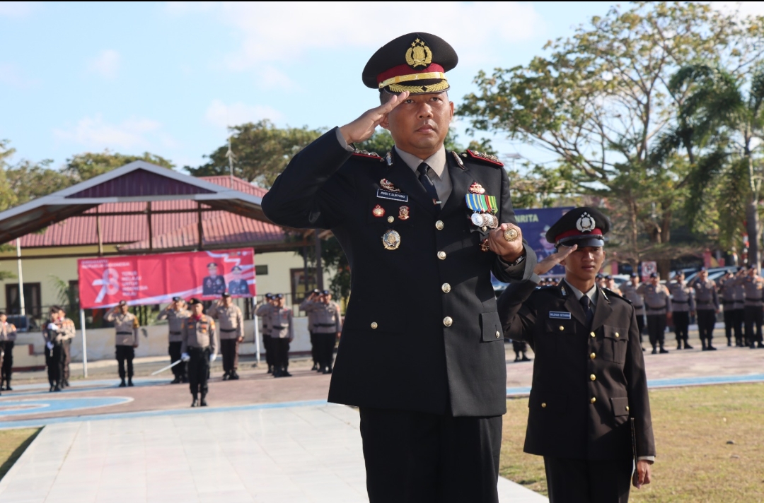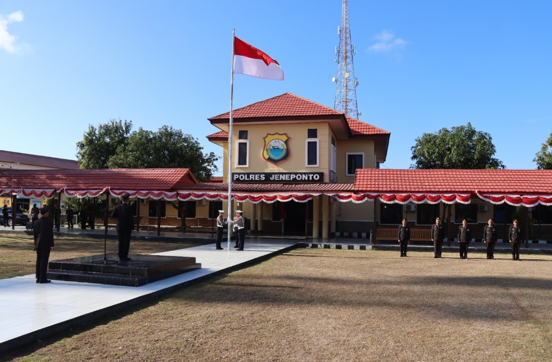 Bertindak Selaku Inspektur upacara AKBP Andi Erma Suryono, S.H, S.IK (Kapolres Jeneponto), Perwira Upacara AKP Nurhadi (Kasubag Kerma Bag Ops) dan Komandan Upacara IPTU Awal Syahrani, S.Hi (KBO Sat Intelkam).