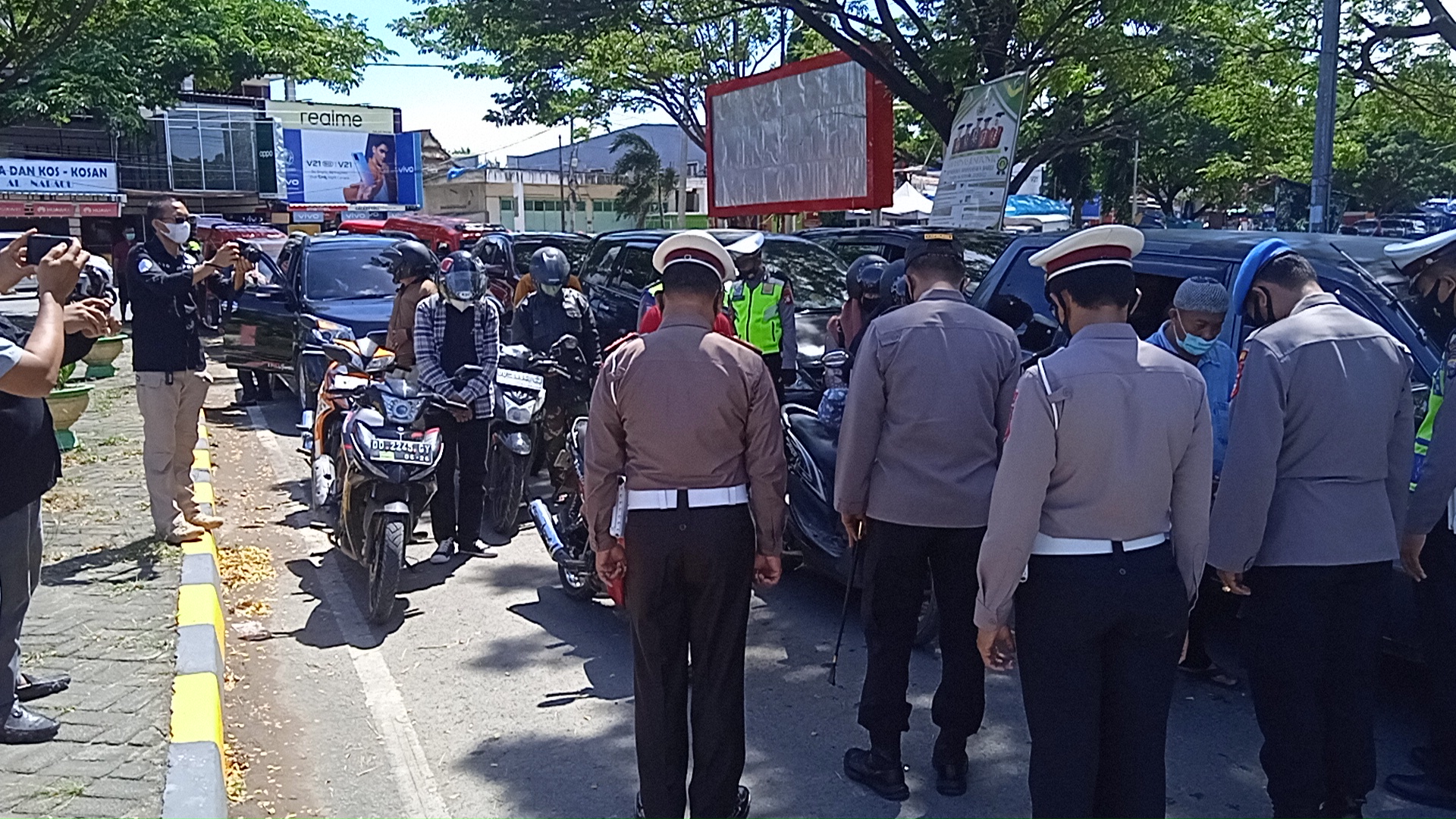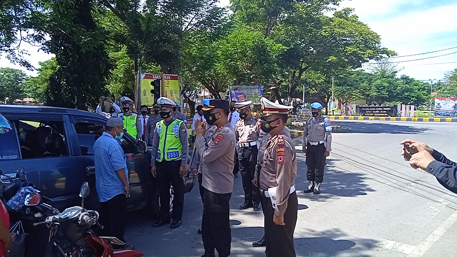 Usai pimpin upacara dihalaman Mapolres, Kapolres Jeneponto, AKBP Yudha Kesit Dwijayanto bersama para Perwira dan personil turun ke jalan memberikan sambutan kepada para pengendara dengan mengajak melakukan doa bersama agar pandemi cepat berlalu.