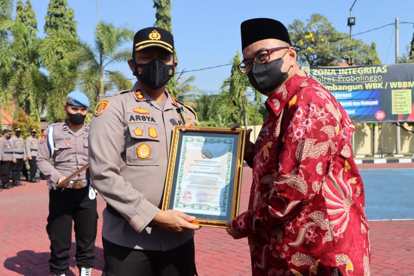 Penghargaan itu diberikan pada saat gelaran Apel di lapangan Mapolres Probolinggo pada Kamis (28/07/2022) yang dihadiri oleh Forkopimda Kabupaten Probolinggo dan diikuti oleh seluruh anggota Polres Probolinggo.