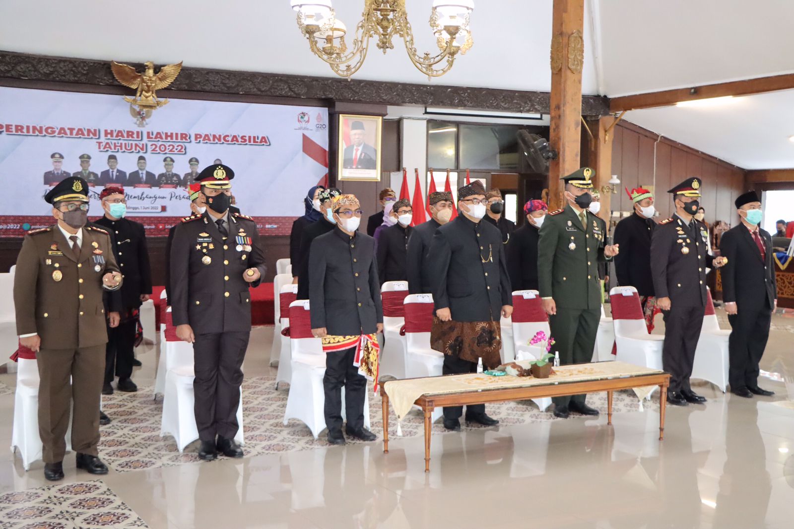 PENJURU.ID | Probolinggo – Kapolres Probolinggo AKBP Teuku Arsya Khadafi bersama Forkopimda Probolinggo mengikuti upacara secara virtual memperingati Hari Lahir Pancasila di Pendopo Prasaja Ngesti Wibawa Kabupaten Probolinggo. Rabu (01/06/2022).