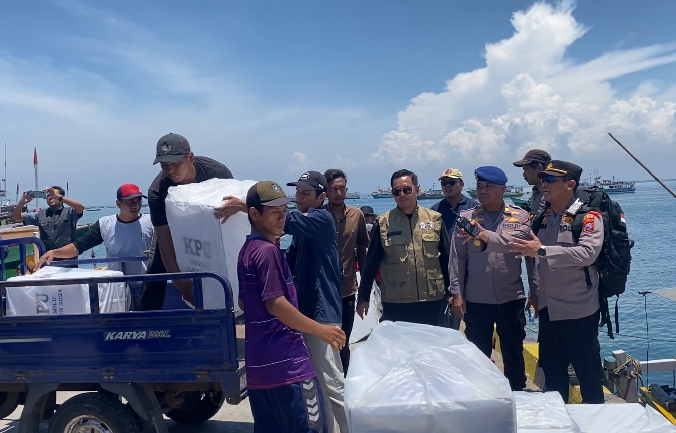 PENJURU.ID | Probolinggo – Distribusi logistik Pemilu 2024 yang mulai dilakukan hari ini, Senin (12/2/2024) mendapatkan pengawalan ketat petugas Polres Probolinggo Kota, Polair dan Kodim 0820 Probolinggo. Salah satunya adalah distribusi ke Pulau Gili Ketapang, Kecamatan Sumberasih Kab. Probolinggo. Pengiriman logistik ini dilakukan menggunakan dua unit kapal penyeberangan. Dikawal satu kapal cepat milik Satpolair.