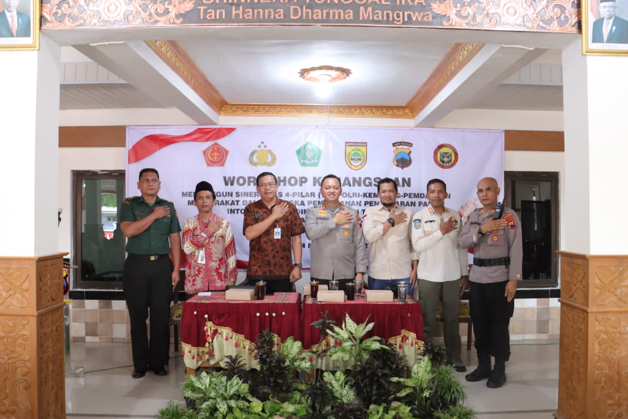 PENJURU.ID|Sukoharjo – Workshop Kebangsaan Polres Sukoharjo dalam membangun sinergitas 4 Pilar (Tni-Polri-Kemenag-Pemda) dan masyarakat terus berlanjut. Kali ini workshop digelar di Pendopo Kantor Kecamatan Nguter, Kamis (24/11/2022).