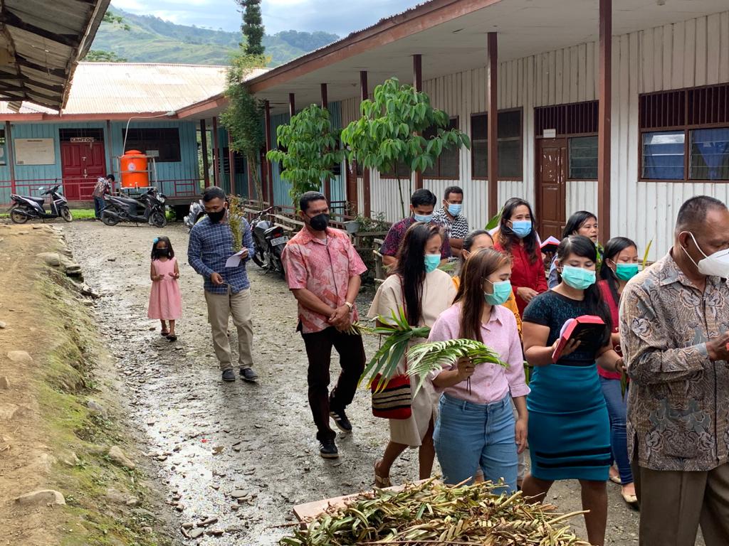 PENJURU.ID | Tolikara – Pelaksanaan ibadah Misa Minggu Palma untuk menyambut hari raya Paskah yang dihadiri oleh Kapolres Tolikara AKBP DR. Y. Takamully, S.H, M.H bersama anggota dan jemaat Paroki Karubaga di SD YPPGI Karubaga, Minggu (28/03).