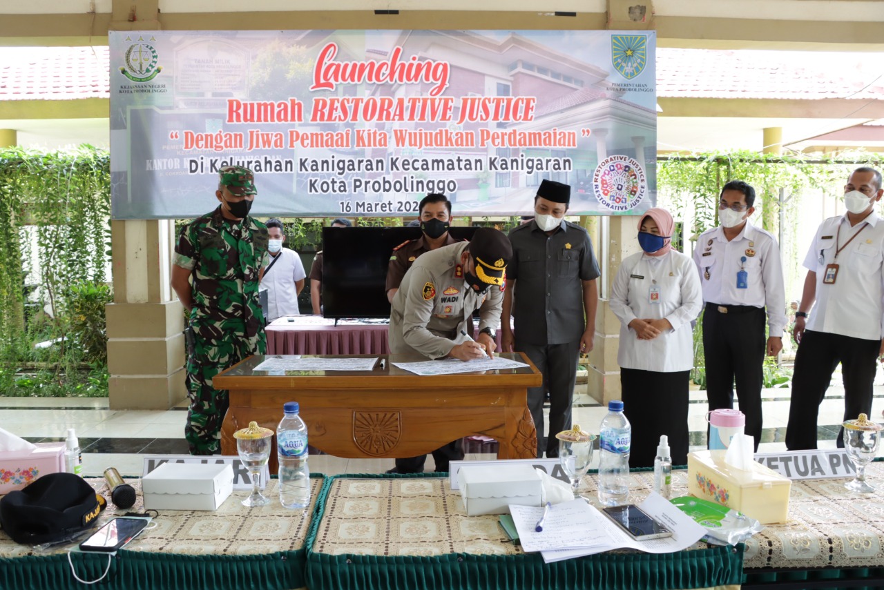 PENJURU.ID | Probolinggo – Kapolres Probolinggo Kota AKBP Wadi Sa’bani S.H., S.I.K. kegiatan launching Rumah Restorative justice (RJ) di Kantor Kecamatan Kanigaran, Kota Probolinggo telah dilaksanakan Launching Rumah Restorative Justice “Dengan Jiwa Pemaaf Kita Wujudkan Perdamaian” diwilayah Kel. Kanigaran Kec. Kanigaran Kota Probolinggo. Rabu (16-03-2022)
