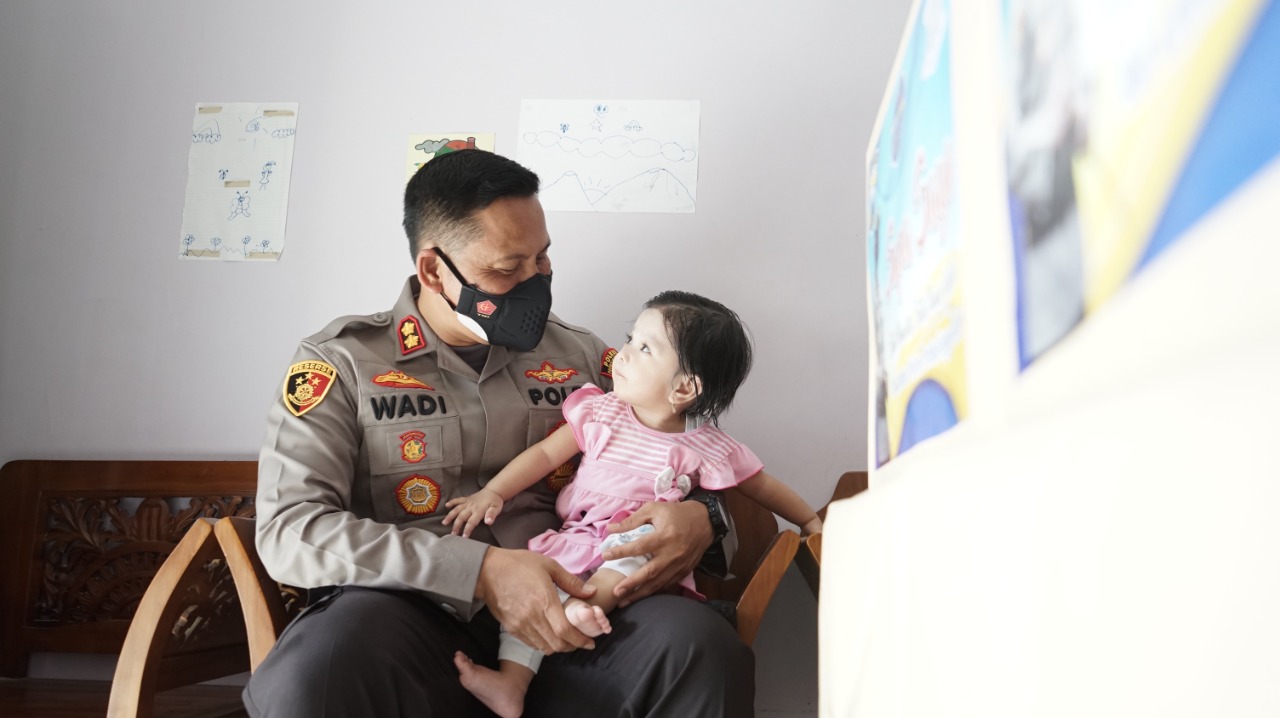 PENJURU.ID | Probolinggo – Kapolres Probolinggo Kota, AKBP Wadi Sa’bani menggendong bayi berusia satu tahun, yang merupakan anak asuh Polisi bagian dari 1 Polisi 1 anak asuh korban Covid-19, Jum’at (19/11/2021). Suasana haru menjadi kian terasa.