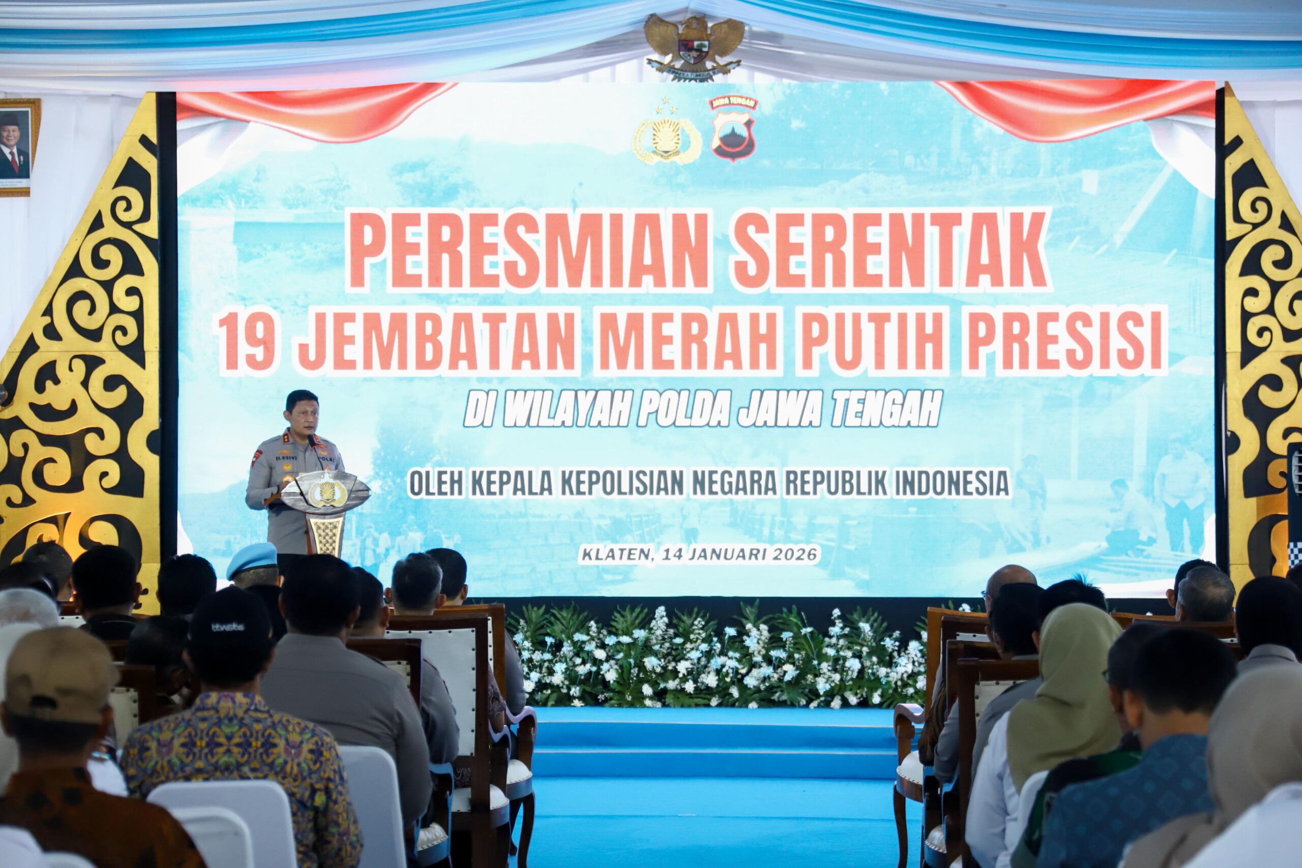 Klaten | Kapolri Jenderal Polisi Listyo Sigit Prabowo meresmikan secara serentak 19 Jembatan Merah Putih Presisi yang telah selesai dibangun di berbagai wilayah Jawa Tengah, Rabu (14/1/2026). Peresmian dipusatkan di Jembatan Merah Putih Presisi yang menghubungkan Desa Cucukan dan Desa Kotesan, Kecamatan Prambanan, Kabupaten Klaten.