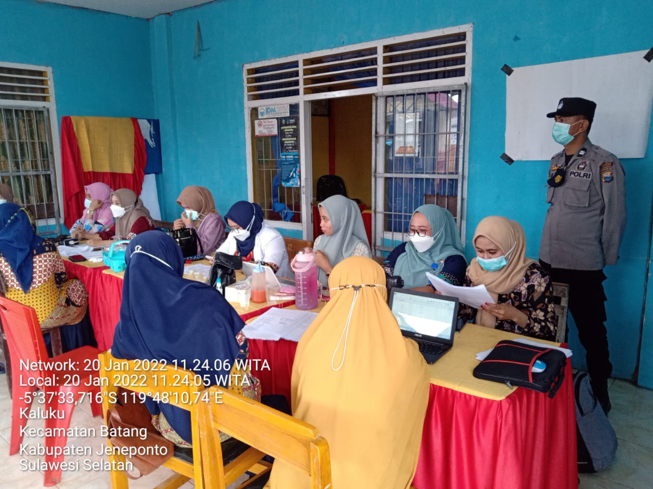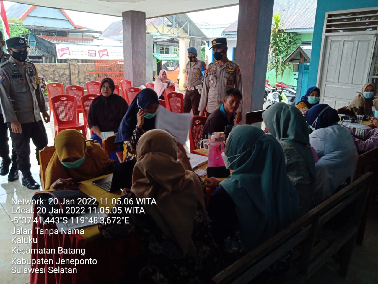 PENJURU. ID | Jeneponto – Personil Polsek Batang di pimpin Iptu Yasiruddin memantau pelaksanaan vaksinasi di Kantor Desa Maccini Baji Kecamatan Batang, Kamis (20/01/2022)