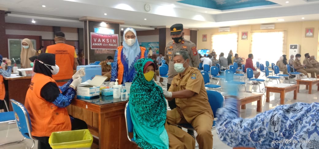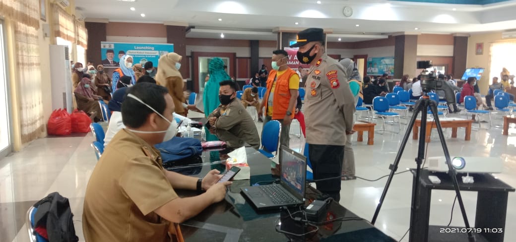 PENJURU. ID | Jeneponto – Kapolsek Binamu, IPTU BAHARUDDIN.S.Sos didampingi Kasi Humas Polsek Binamu, AIPDA RIDWAN memantau pelaksanaan serbuan Vaksinasi massal yang berlangsung di Ruang Pola Kantor Bupati Kabupaten Jeneponto, Senin (19/07/2021).