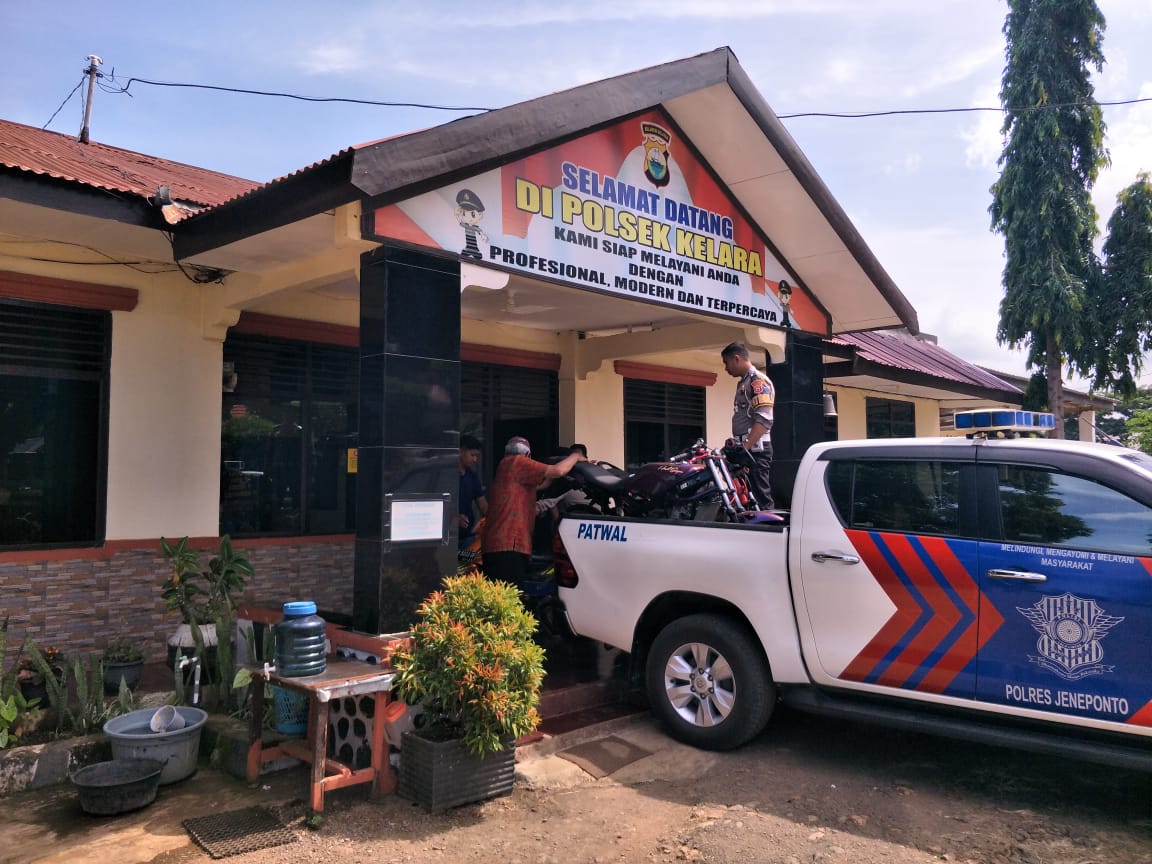 PENJURU. ID | Jeneponto – Kapolsek Kelara Iptu Bakri, S.Sos.,MM., memerintahkan piket Ka SPKT Bripka Muh. Ayub untuk menyerahkan 3 (tiga) unit sepeda motor yang merupakan hasil razia Bali (balap liar) kepada Sat Lantas Polres Jeneponto agar dibawa ke Polres Jeneponto untuk dikandangkan, Kamis (22/04/2021).
