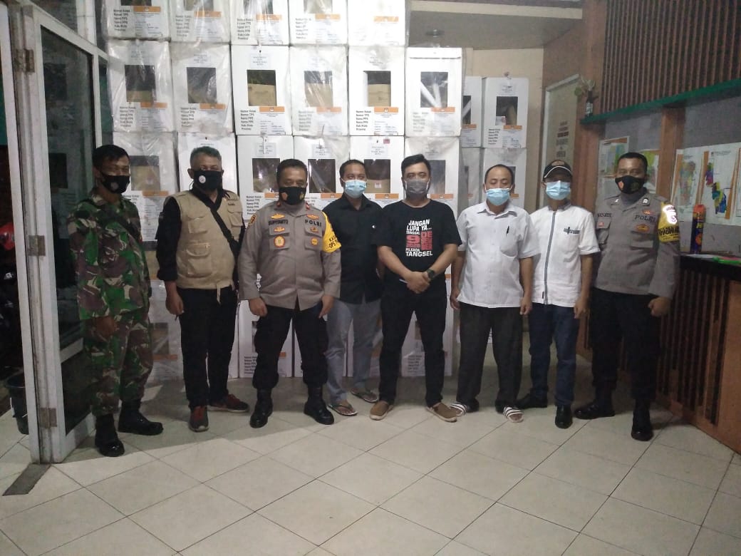PENJURU.ID | Tangsel – Kapolsek Pamulang Polres Tangsel, KOMPOL. SUPIYANTO, SH. didampingi oleh Kanit Intel Sek. Pamulang IPTU. GANDUNG NOVI SUSANTO, SE. melakukan pengecekan Kotak dan surat suara yang telah didistribusikan ke PPK Pamulang, bertempat di Sekretariat PPK Pamulang Jl. Siliwangi No. 1, Kel. Pamulang Barat, Kec. Pamulang, Kota Tangerang Selatan. Rabu malam, (9/12/2020) pukul 20.00 WIB.