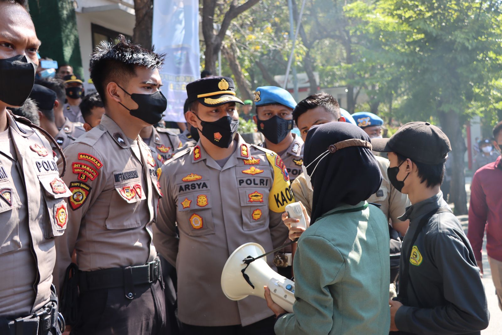 “Kami disini mengawal kegiatan penyampaian aspirasi mahasiswa sekalian agar tetap simpatik dan tidak melanggar hak masyarakat umum lainnya. Jadi kami meminta kepada mahasiswa agar tidak mengganggu pengguna jalan atau kegiatan masyarakat lainnya,” ucap Kapolres Probolinggo didepan massa mahasiswa.