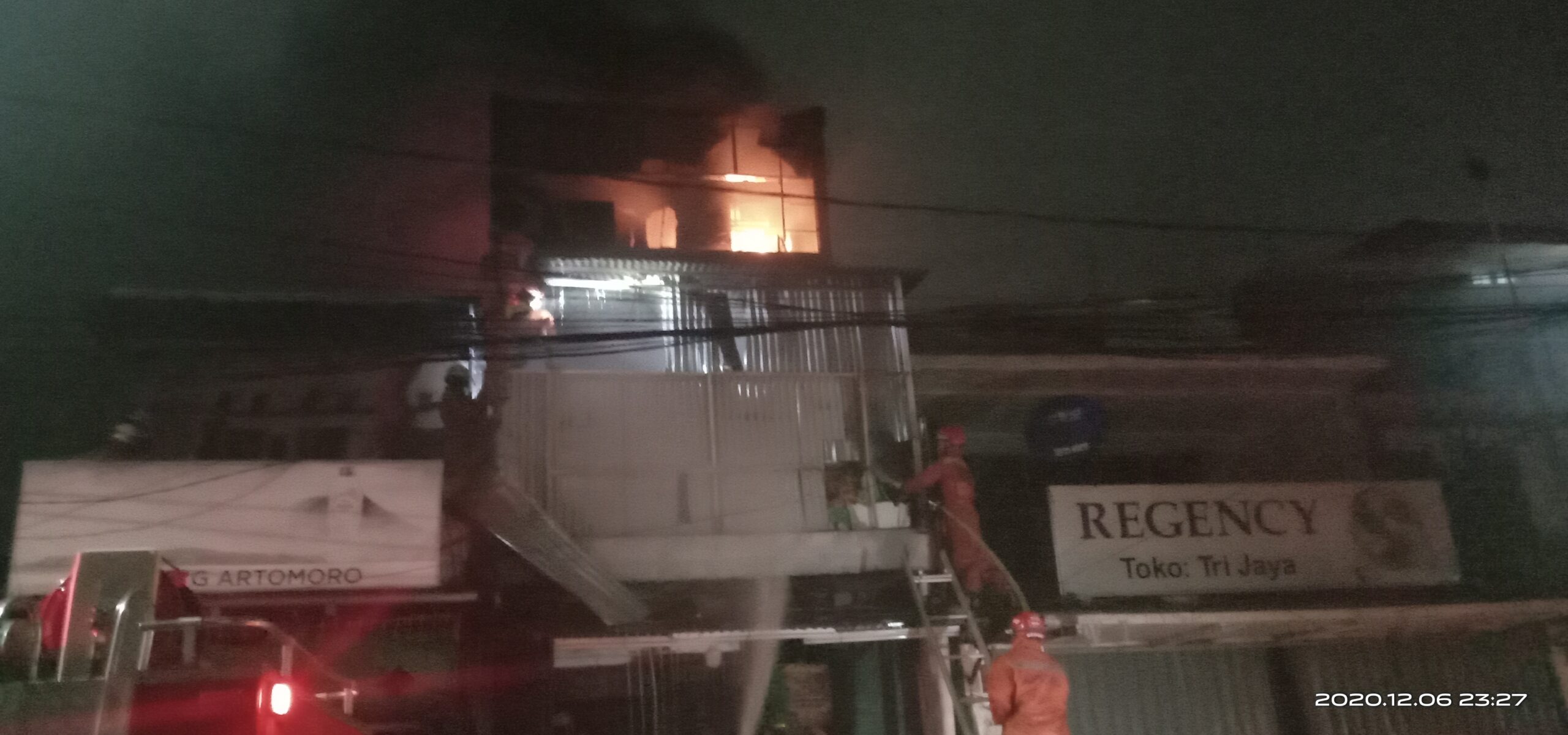 Kebakaran terjadi pada Minggu malam, (06/12/20), pukul 23.00 Wib. Walaupun diguyur hujan deras, tidak membuat api padam. Terlihat dari lantai 2 ruko milik warga tersebut api terus menjalar ke lantai 3.