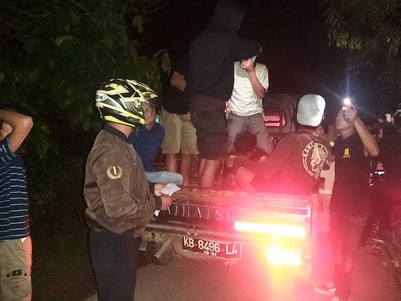 Beriringan dengan kendaraan Sepeda Motor merk Honda Supra X ( KB 4385 BH) yang dikendarai oleh C. Noval (16 th), Pelajar, dengan memboncengi Indra Wahyu (17) th, Pelajar, dengan kecepatan tinggi dengan kondisi jalan yang sempit dan gelap serta menikung menyebabkan kendaraan Yamaha Jupiter Z (B 6314 PIO) Mengenai bemper lampu depan sebelah kanan Mobil Daihatsu Sigra (KB 1427 LF) sehingga kendaraan yamaha Jupiter Z (B 6314 PIO) Kehilangan kendali dan menabrak bagian belakang motor Honda Supra X (KB 4385 BH) sehingga Kendaraan Motor Honda Supra X hilang kendali danbmenabrak tembok rumah warga yang disamping jalan. Jelas Briptu Hendro.