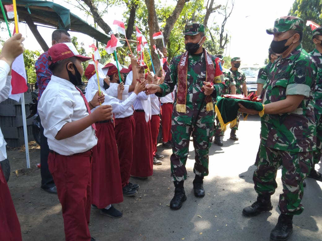 PENJURU.ID | Probolinggo – Kemeriahan dan keceriaan puluhan siswa dari Sekolah Dasar (SD) Klampok satu terlihat saat mereka berdiri dipinggir jalan menunggu kedatangan Tim Pengawasan dan Evaluasi (WASSEV) KASAD dalam rangka pengecekan pembangunan kegiatan Tentara Manunggal Membangun Desa (TMMD) ke 114 di Desa Klampok Kecamatan Tongas Kabupaten Probolinggo, Kamis (04/08/2022) pagi.