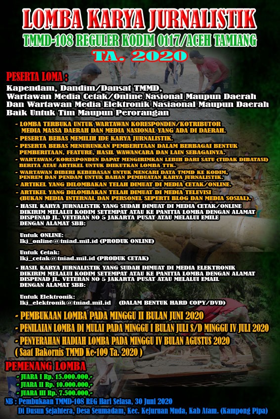 Sertu Tri Mulyadi Pendim 0117/Atam menerangkan, “Karya bisa juga dikirim langsung ke panitia lomba karya jurnalistik TMMD melalui email: lkj_cetak@tniad.mil.id dan lkj_online@tniad.mil.id dengan menyertakan nama, alamat, media dan nomor HP peserta, atau dapat dikirim langsung ke Dispenad Jalan Veteran 5 Jakarta Pusat (bila dalam bentuk hardcopy kliping media beserta link media yang memuat).