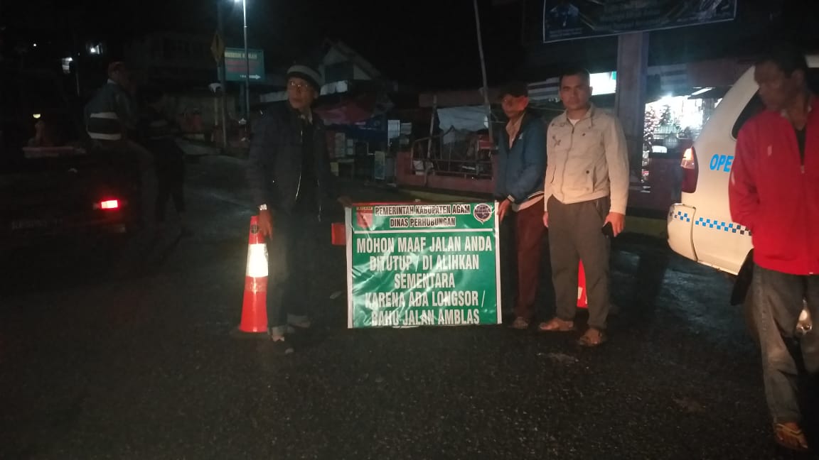 Lutfi menyampaikan, penanganan selanjutnya sudah koordinasi dengan PUTR Provinsi Sumatera Barat dan Kabupaten Agam guna penanganan selanjutnya jalan ditimpa bencana itu. Dinas Perhubungan Kabupaten Agam sudah memasang rambu dan papan informasi bahwa jalan tersebut ditutup. Beberap petugas dan warga berada dipinggir jalan yang amblas.