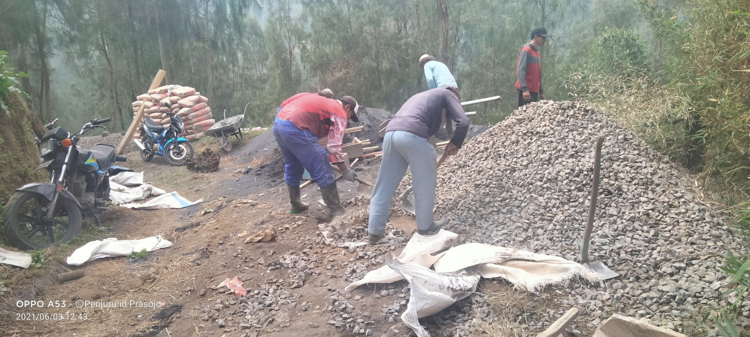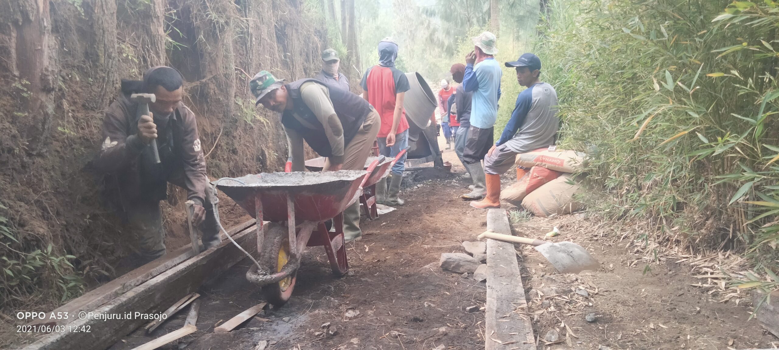 PENJURU.ID | Probolinggo – Jalan terjal berliku menuju areal pertanian produktif, di wilayah Desa Wonotoro, Kecamatan Sukapura, Kabupaten Probolinggo, menjadi prioritas dalam pelaksanaan pembangunan untuk mempercepat roda dan pertumbuhan perekonomian di Desa, kepala Desa Wonotoro bersama warganya, bahu membahu melakukan pengecoran jalan agar nantinya transportasi dari dan menuju areal pertanian semakin lancar. Kamis (03/06/2021)