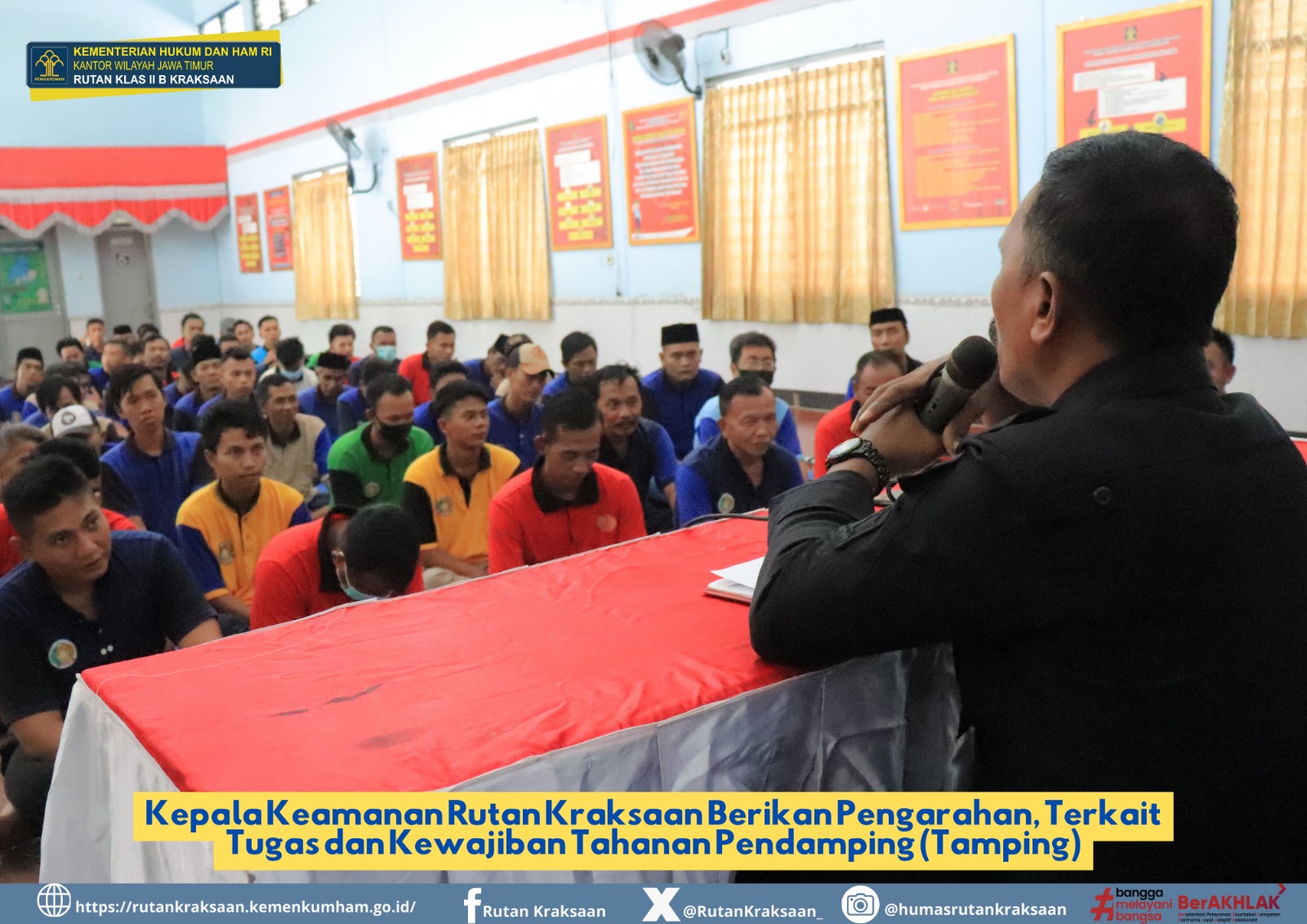 PENJURU.ID | Probolinggo – Dalam rangka menjaga keamanan dan ketertiban di Rutan Kelas IIB Kraksaan Kanwil Kemenkumham Jawa Timur, Kepala Kesatuan Pengamanan (Zainol Hasan S.H) memberikan pengarahan kepada seluruh Tahanan Pendamping (Tamping) terkait tentang tugas dan kewajiban mereka di Rutan Kelas IIB Kraksaan.