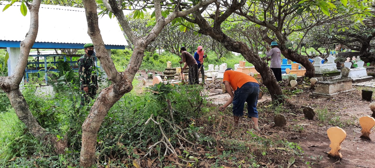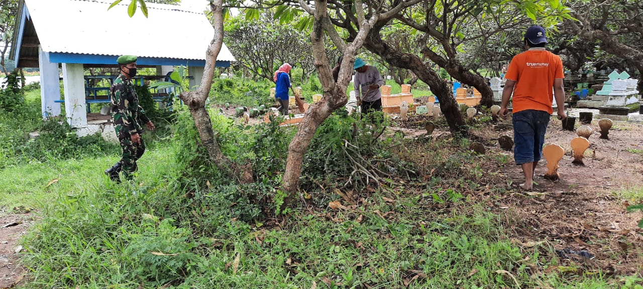 Tak segan dan malu Serma. Edi Santoso, Babinsa. Koramil 0820/26 Tegal Siwalan, tanpa melepaskan seragam lorengnya, bersama kurang lebih 10 orang warganya, melaksanakan kegiatan pembersihan makam.