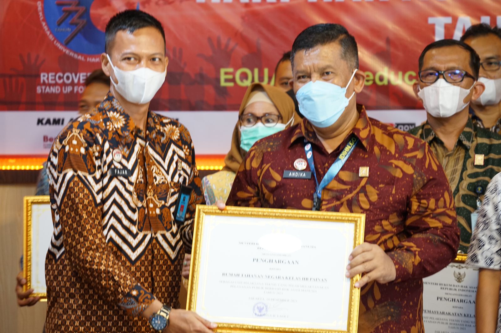 Penghargaan tersebut langsung diserahkan Oleh Kepala Kantor Wilayah Kemenkumham Sumatera Barat R. Andika. “Alhamdulillah, kami menerima penghargaan dari bapak Menteri Hukum dan HAM yang diserah akan oleh Kakanwil Kemenkumham Sumbar sebagai Rutan yang telah melaksanakan pelayanan publik berbasis HAM, kedepannya kami akan terus berbenah agar pelayanan semakin maksimal dan prima” ujar Fajar selaku Kepala Rutan Painan.