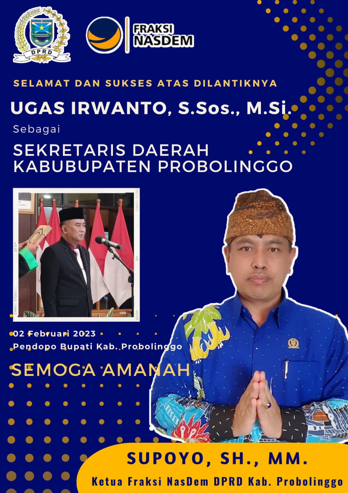 Ketua fraksi Nasdem Supoyo SH MM yang merupakan putra daerah asli Tengger kecamatan Sukapura kabupaten probolinggo, juga mengucapkan selamat dan sukses atas dilantiknya Ugas Irwanto sebagai Sekda Pemkab Probolinggo.