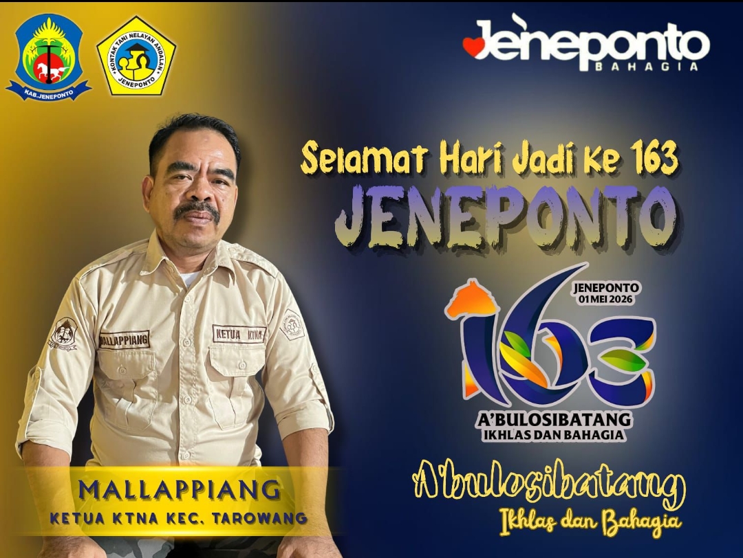 PENJURU. ID | Jeneponto – Peringatan Hari Jadi ke-163 Kabupaten Jeneponto tahun 2026 disambut dengan penuh semangat oleh berbagai elemen masyarakat. Salah satunya datang dari Ketua KTNA Terpilih Kecamatan Tarowang , Mallappiang, yang turut menyampaikan ucapan selamat dan harapan bagi kemajuan daerah.
