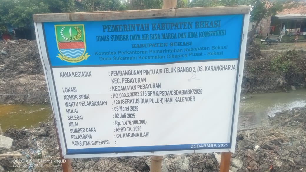 PENJURU.ID I Kabupaten Bekasi – Proyek pembangunan Pintu Air Teluk Bango 2 yang berasal dari Dinas Sumber Daya Air Bina Marga dan Bina Kontruksi (DSDABMBK) dengan anggaran Rp. 1.476.100.300, APBD tahun 2025, dengan pelaksana CV.Karunia Ilahi menuai sorotan tajam dari penggiat lingkungan hidup Saman Hudi atau lebih dikenal Ki Jaga Kali. Proyek tersebut berlokasi di Desa Karangharja, Kecamatan Pebayuran, Kabupaten Bekasi.