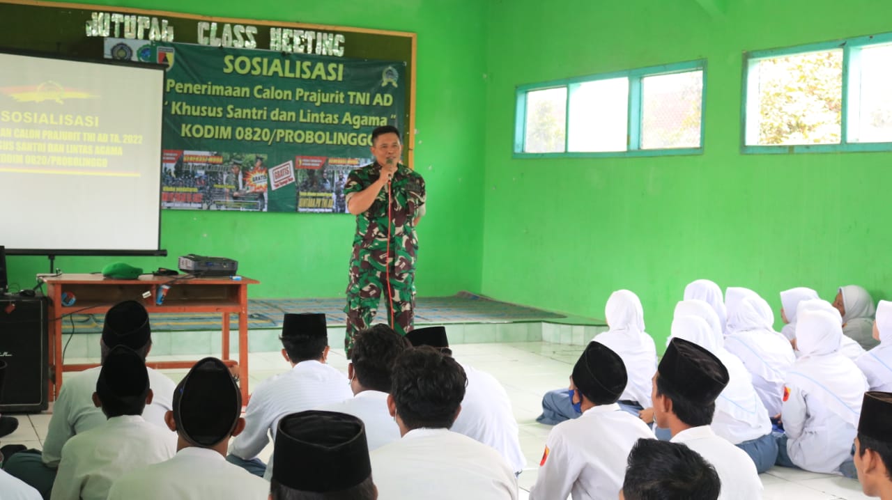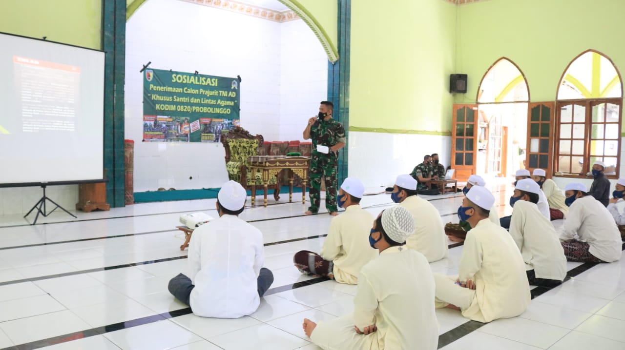 Dalam sosialisasi tersebut Perwira Seksi Personalia Kodim 0820/ Probolinggo Kapten Inf Yahuddin menyampaikan kampanye penerimaan TNI AD khusus Santri dan Lintas Agama di Pondok Pesantren untuk mengajak para santri mengabdikan diri kepada bangsa dengan menjadi seorang prajurit TNI – AD.