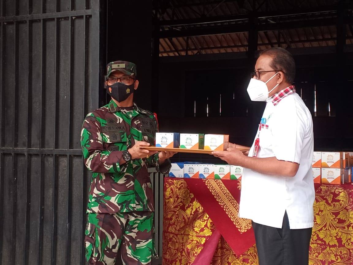 PENJURU.ID | TABANAN – TNI Kodim 1619/Tabanan kembali menyerahkan bantuan obat-obatan untuk warga yang terpapar covid-19, kali ini bantuan obat-obatan tersebut diserahkan secara simbolis oleh Kasdim Mayor Inf Dewa Putu Oka mewakil Dandim 1619/Tabanan Letkol Inf Ferry Adianto S.I.P yang diterima oleh Kepala Dinas Kesehatan Kabupaten Tabanan Dr. I Nyoman Suratmika M. Kes di GOR Debes Tabanan, pada Rabu (21/7/2021).