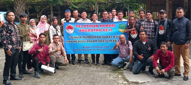 Kegiatan Pelatihan Hukum Angkatan ke – II di selenggarakan bertempat Balai Kambang Resto, Balaraja – Tangerang, Banten, pada hari Minggu (13/02/2022) Siang. Dalam kegiatan ini mengundang narasumber Mohammad Syafi’i, S.H dan M Irwan Bani Saldan, S.H., M.Kn (Advokat, Founding & Partner Law Firm IMS & Associates Attorney At Law) dan Ria Putri Nurmayasari (Sekretaris KOMANDO HAM) selaku moderator.