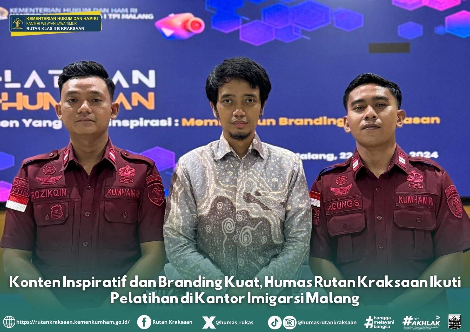 Pelatihan ini, yang mengusung tema “Konten yang Menginspirasi: Membangun Branding Kehumasan,” diselenggarakan di Kantor Imigrasi Kelas I TPI Malang dan diikuti oleh humas satuan kerja (satker) Kementerian Hukum dan Hak Asasi Manusia (Kemenkumham) Jawa Timur se-Korwil Malang . Kamis (22/08)