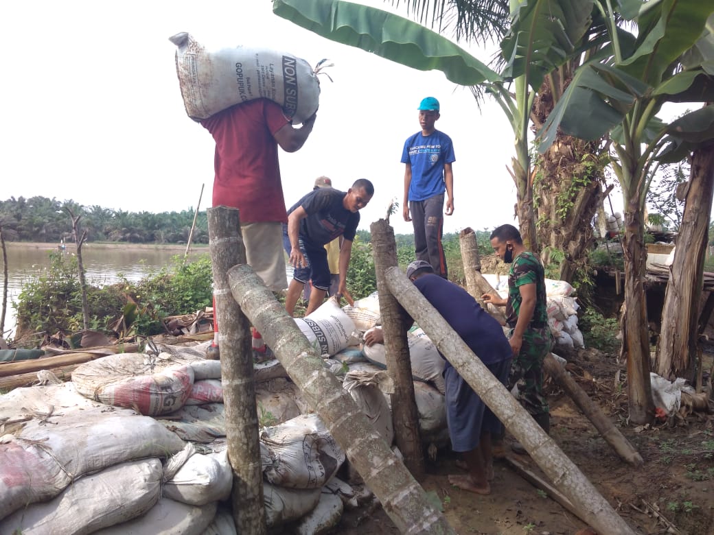 PENJURU.ID | Aceh Tamiang – Untuk membantu mengatasi kesulitan masyarakat di wilayah binaan Koramil 04/Bendahara dibawah kendali Danramil Kapten Inf Said Muhammad bersama Muspika Kec. Bendahara bergotong Royong Perbaiki Tanggul sungai yang jebol pasca diterpa banjir. Sepanjang ± 20 M tepatnya Di Desa Teluk Halban, Kec. Bendahara, Kab. Aceh Tamiang, jumat (03/07/20).