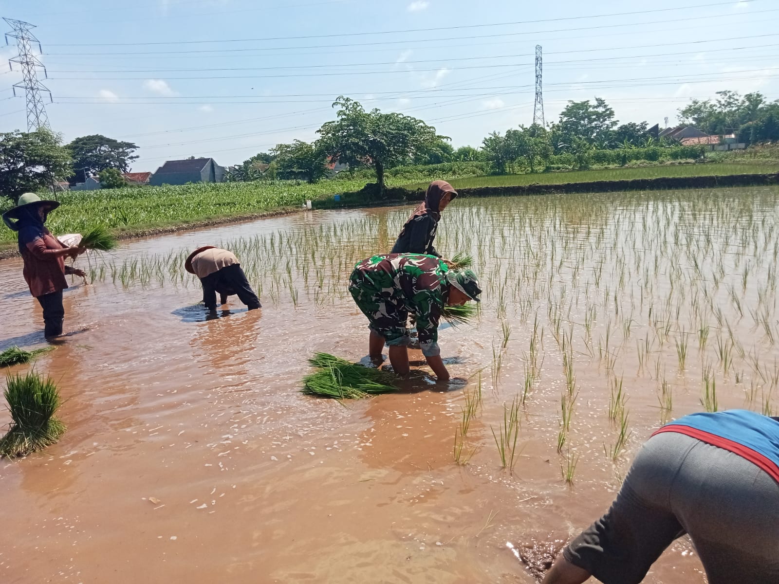 PENJURU.ID | Probolinggo – Koramil 0820/07 Wonomerto kembali melaksanakan karya bakti dengan mendampingi petani yang sedang melakukan pananaman bibit padi di area sawah milik salah satu warga Dusun Krajan, Desa Kareng Kidul, Kecamatan Wonomerto, Kabupaten Probolinggo, Rabu (7/2).