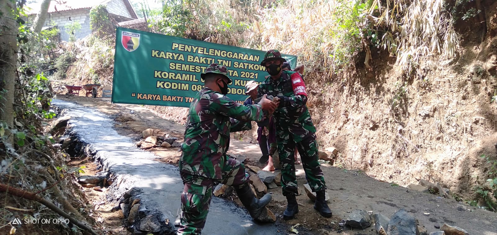 PENJURU.ID | Probolinggo – Untuk meringankan beban masyarakat, membangun Desa, dalam bulan Karya Bhakti TNI semester II TA 2021, Koramil 0820/10 Kuripan, turun langsung ke lokasi perbaikan jalan di Dusun Pusong Lor Rt 09, Rw 03, Desa Wringinanom, bersama warga dan tokoh masyarakat Anggota Koramil 0820/10 berbaur melaksanakan Karya Bhakti. Senin (11/10/2021).