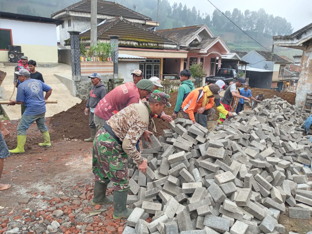 PENJURU.ID | Probolinggo – Koramil 0820/11 Sumber bersama masyarakat Desa Ledokombo Kecamatan Sumber Kabupaten Probolinggo kerja bakti melakukan pemasangan paving di jalan desa setempat, Rabu (27/04/2022)