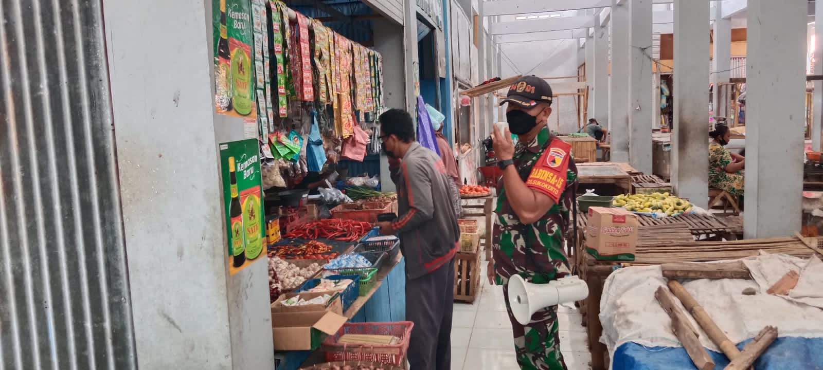 PENJURU.ID | Probolinggo – Koramil 0820/15 Pajarakan, bersama tim satgas covid memberlakukan pembatasan kegiatan masyarakat (PPKM) level II dengan melaksanakan operasi yustisi sekaligus memberikan sosialisasi dan edukasi berkaitan dengan penegakan dan penerapan protokol kesehatan di pasar tradisional setempat.