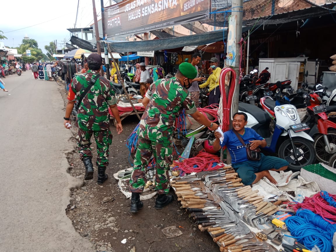 PENJURU.ID | Probolinggo – Koramil 0820/18 Kotaanyar bersama tim satgas covid memberlakukan pembatasan kegiatan masyarakat (PPKM) level I dengan melaksanakan operasi yustisi sekaligus memberikan sosialisasi dan edukasi berkaitan dengan penegakan dan penerapan protokol kesehatan di pasar tradisional setempat.