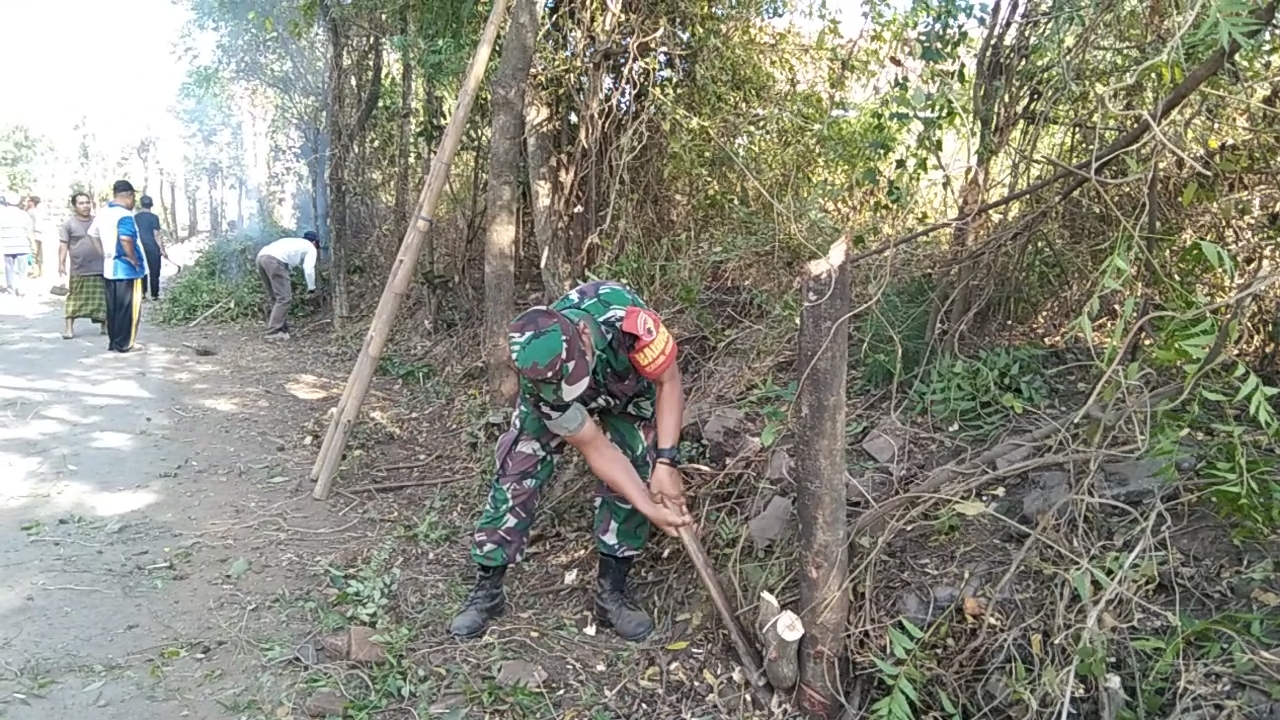 Serda Moh. Jumadi, anggota Koramil 0820/04 Bantaran menyampaikan bahwa untuk kerja bakti kali ini yakni membersihkan jalan desa yang berlokasi di Dusun Pengumbin RT 22 RW 06 Desa Kramat Agung Kecamatan Bantaran Kabupaten Probolinggo.