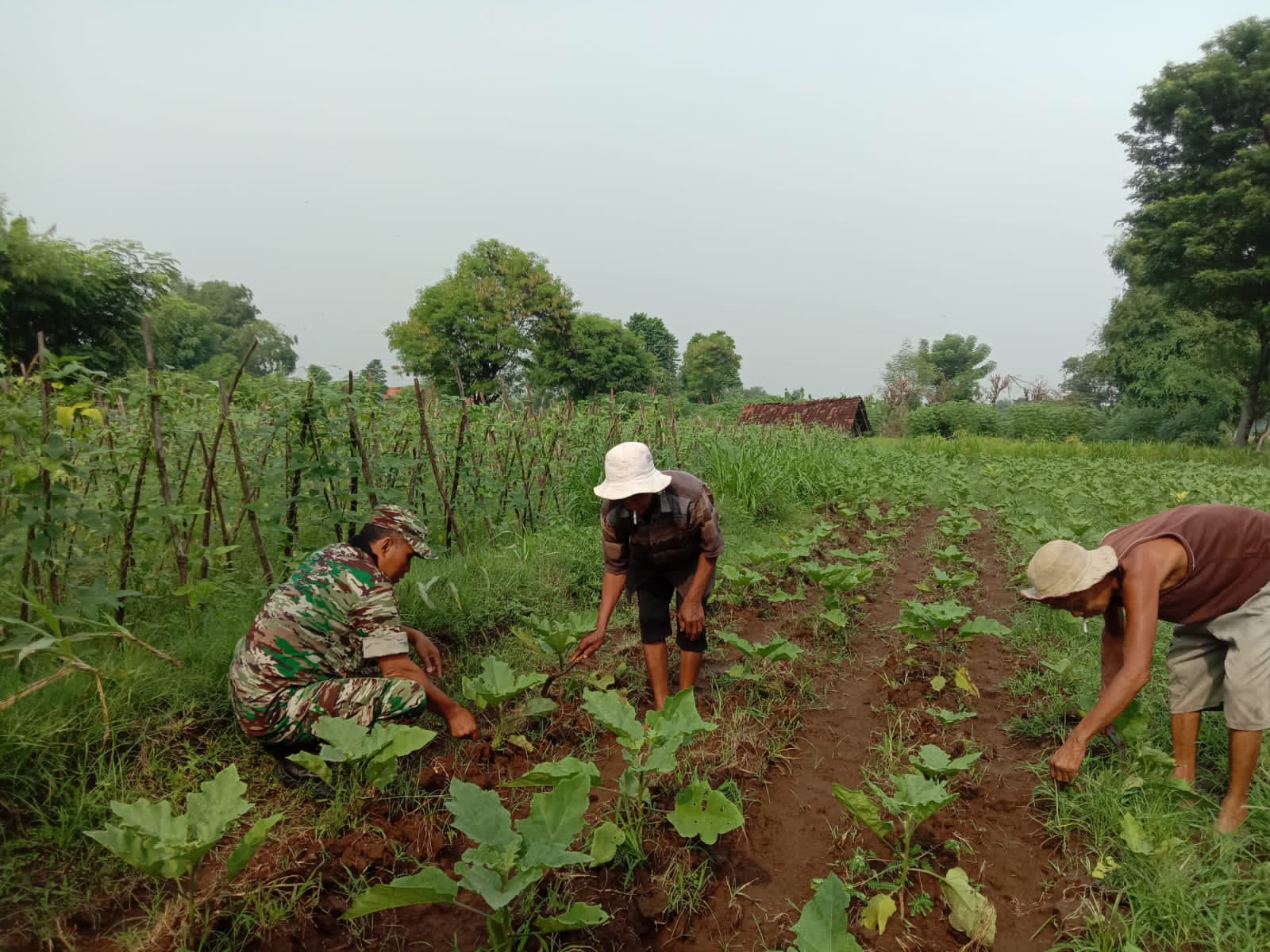 PENJURU.ID | Probolinggo – Koramil 0820/04 Bantaran kembali melaksanakan karya bakti dan komunikasi sosial (komsos) dengan mendampingi petani yang sedang melakukan perawatan tanaman terong di kebun milik salah satu warga Dusun Bata, Desa Besuk, Kecamatan Bantaran, Kabupaten Probolinggo, Sabtu (24/2).