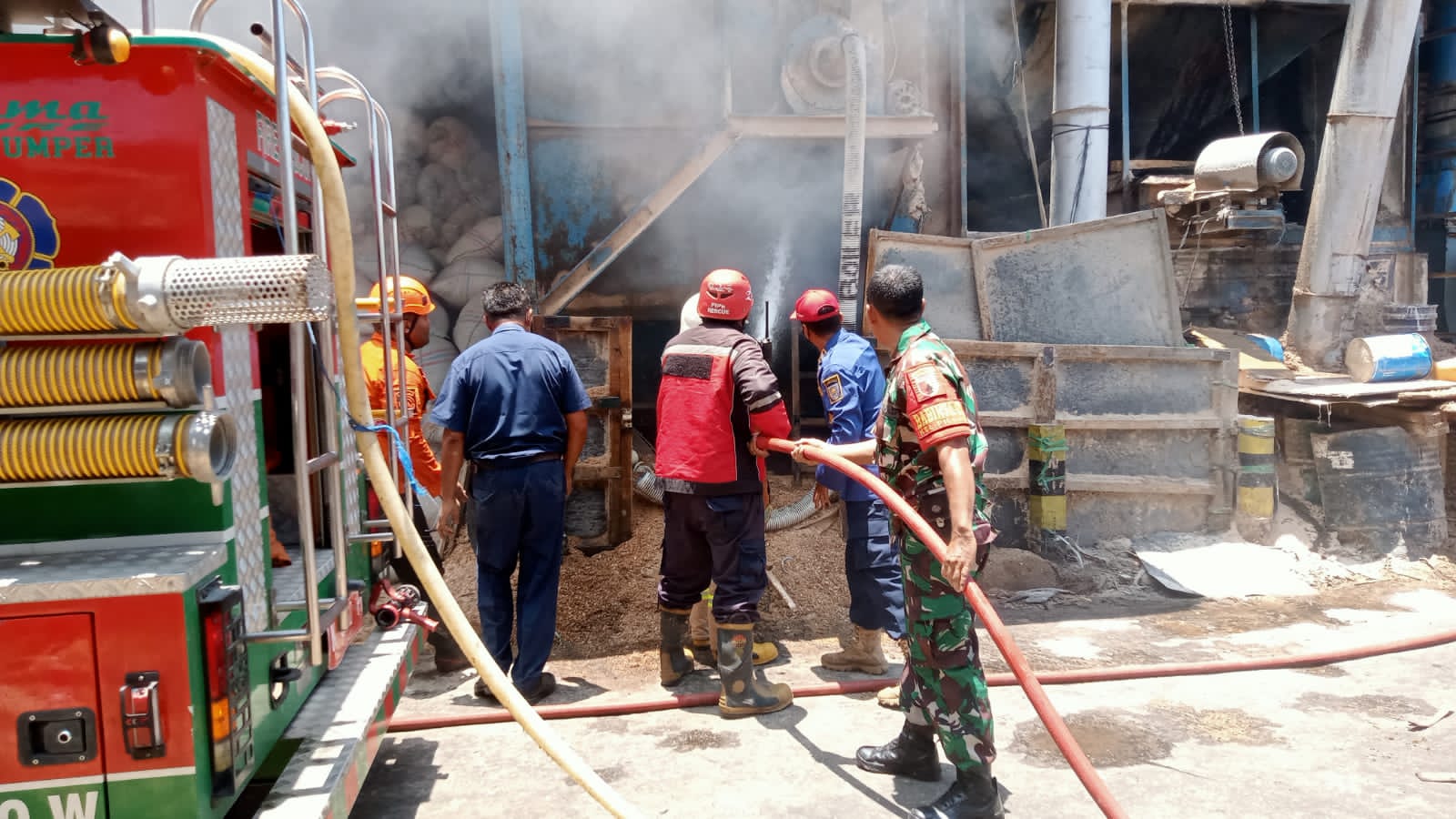 PENJURU.ID| Probolinggo – Koramil 0820/01 Kanigaran ikut ambil bagian dalam proses pemadaman di gudang penyimpanan serbuk (Dust Colector) PT. BFI yang beralamatkan di jalan Brantas, Kelurahan Pilang, Kota Probolinggo.