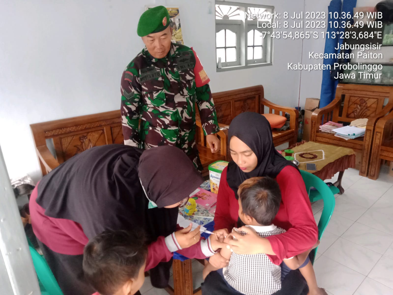 PENJURU.ID | Probolinggo – Koramil 0820/16 Paiton melakukan pemantauan sekaligus pendampingan dalam kegiatan pemberian vaksin ori difteri tahap I dengan sasaran sasaran balita umur 1-4 tahun di Desa Jabung Sisir Kecamatan Paiton Kabupaten Probolinggo. Rabu (12/07/2023)