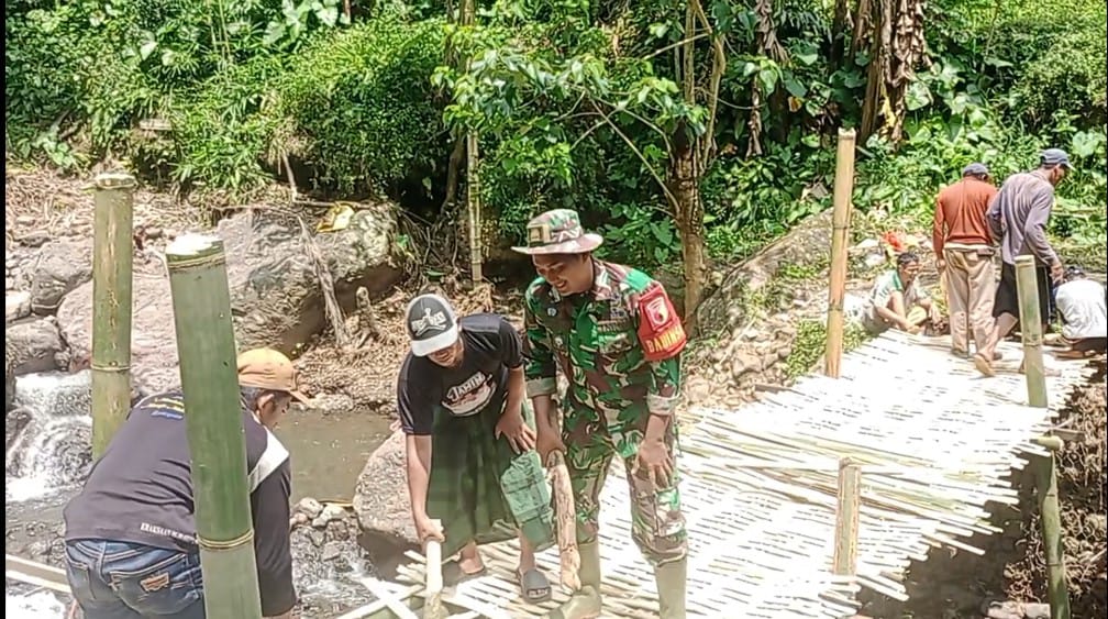 PENJURU.ID | Probolinggo – Koramil 0820-17/Pakuniran bersama puluhan masyarakat melaksanakan kerja bakti berupa pembangunan jembatan darurat yang merupakan akses jalan penghubung di Desa Gunggungan Kidul, Kecamatan Pakuniran, Kabupaten Probolinggo, Senin (6/4).