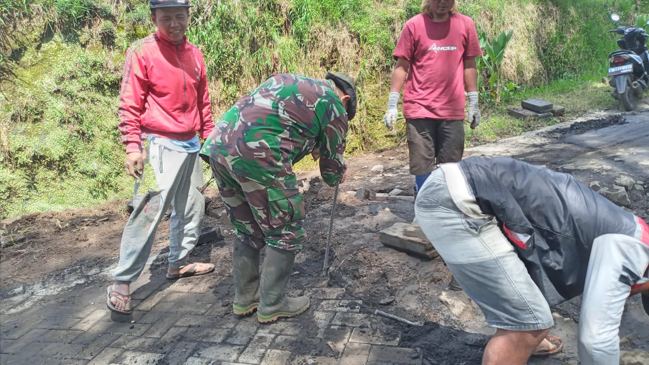 PENJURU.ID | Probolinggo – Koramil 0820/11 Sumber kembali melaksanakan kerja bakti berupa pemasangan paving di jalan desa dalam wilayah Desa Ledokombo, Kecamatan Sumber, Kabupaten Probolinggo, Rabu (26/04/2023)
