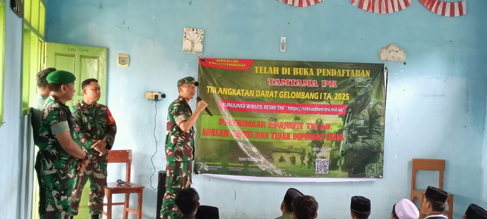 Kodim 0820/Probolinggo melalui Koramil jajaran melaksanakan pendampingan dalam pelaksanaan sosialisasi penerimaan calon Tamtama PK TNI AD gelombang I tahun 2025 yang di prakarsai oleh Bidang Pers Kodim 0820/Probolinggo.
