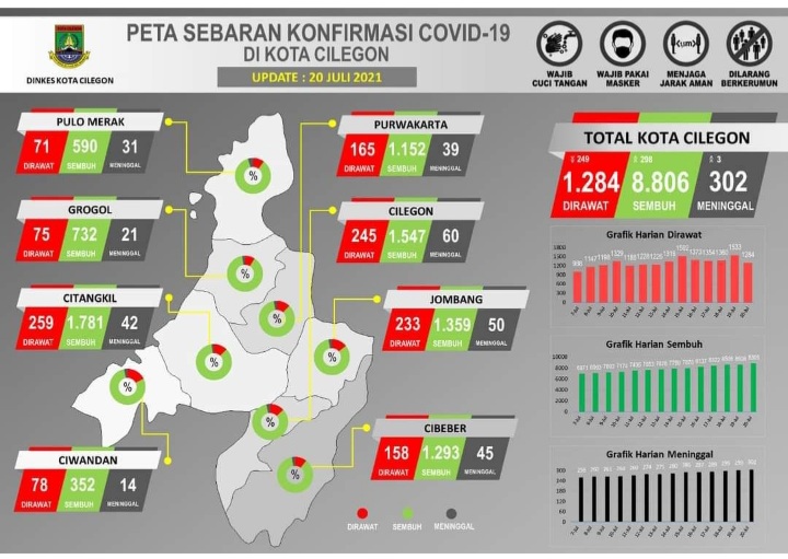 Berdasarkan data yang ada di Dinas Kesehatan (Dinkes) Kota Cilegon, jumlah pasien Covid-19 berkurang dari 1.553 menjadi 1.282 orang atau turun sebanyak 269 orang. Meski begitu, Kota Cilegon kini berstatus Zona merah