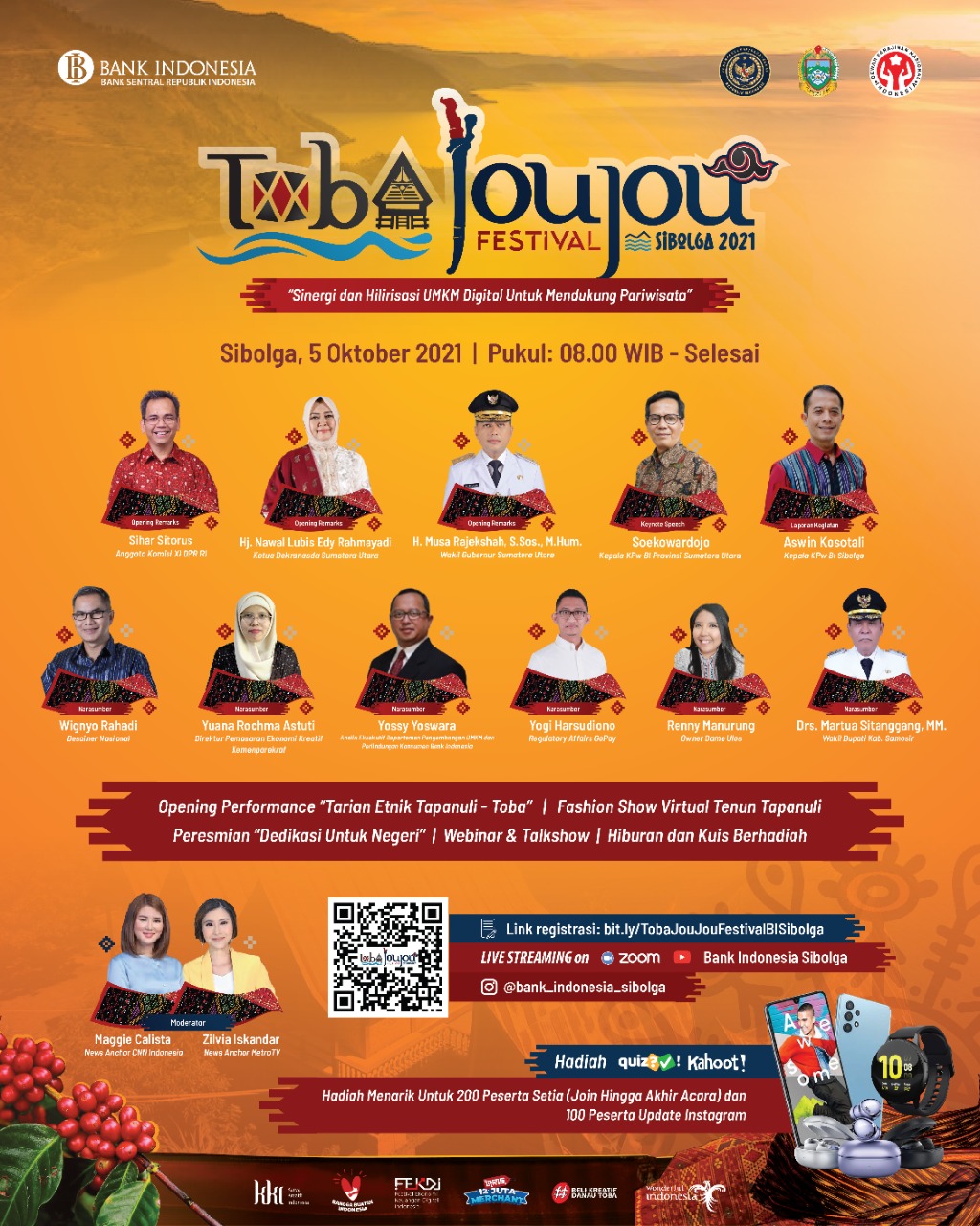 Webinar yang berisikan edukasi dan sosialisasi secara interaktif ini dapat diikuti melalui linkzoom : http//bit.ly/TobaJouJouFestival/BISibolga dengan nomor ID:897 5039 5152, passcode : TOBAJOUJOU, menghadirkan narasumber, Wignyo Rahadi (Desainer Nasional) serta dari Kementerian Pariwisata, Departemen Pengembangan UMKM dan Perlindangan Konsumen BI.