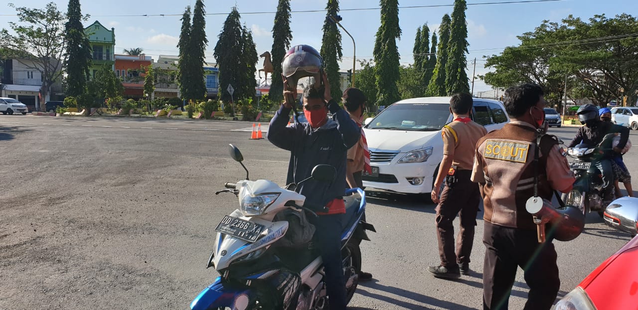 PENJURU. ID | Jeneponto – Saka Bhayangkara Polres Jeneponto yang didampingi oleh Personil Sat Binmas Polres Jeneponto dipimpin oleh AKP Syahrul, SH, dan Pamong Saka Bhayangkara, Haris GU, melakukan sosialisasi Peraturan Bupati Jeneponto No. 37 tahun 2020 yang dilaksanakan di area perempatan Lampu Merah Jl. St. Hasanuddin Kelurahan Empoang, Kecamatan Binamu Kabupaten Jeneponto, Jumat (25/09/2020) sekitar Pukul 16.30 Wita.